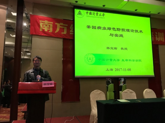 2017年度中國南方主要農作物病蟲綠色防控培訓班于11月6—8日在上海舉辦,應農業部全國農技中心邀請,韓寶瑜教授主講了茶樹病蟲的綠色防控,其中着重講授了昆蟲信息素制劑等新技術新産品的應用。